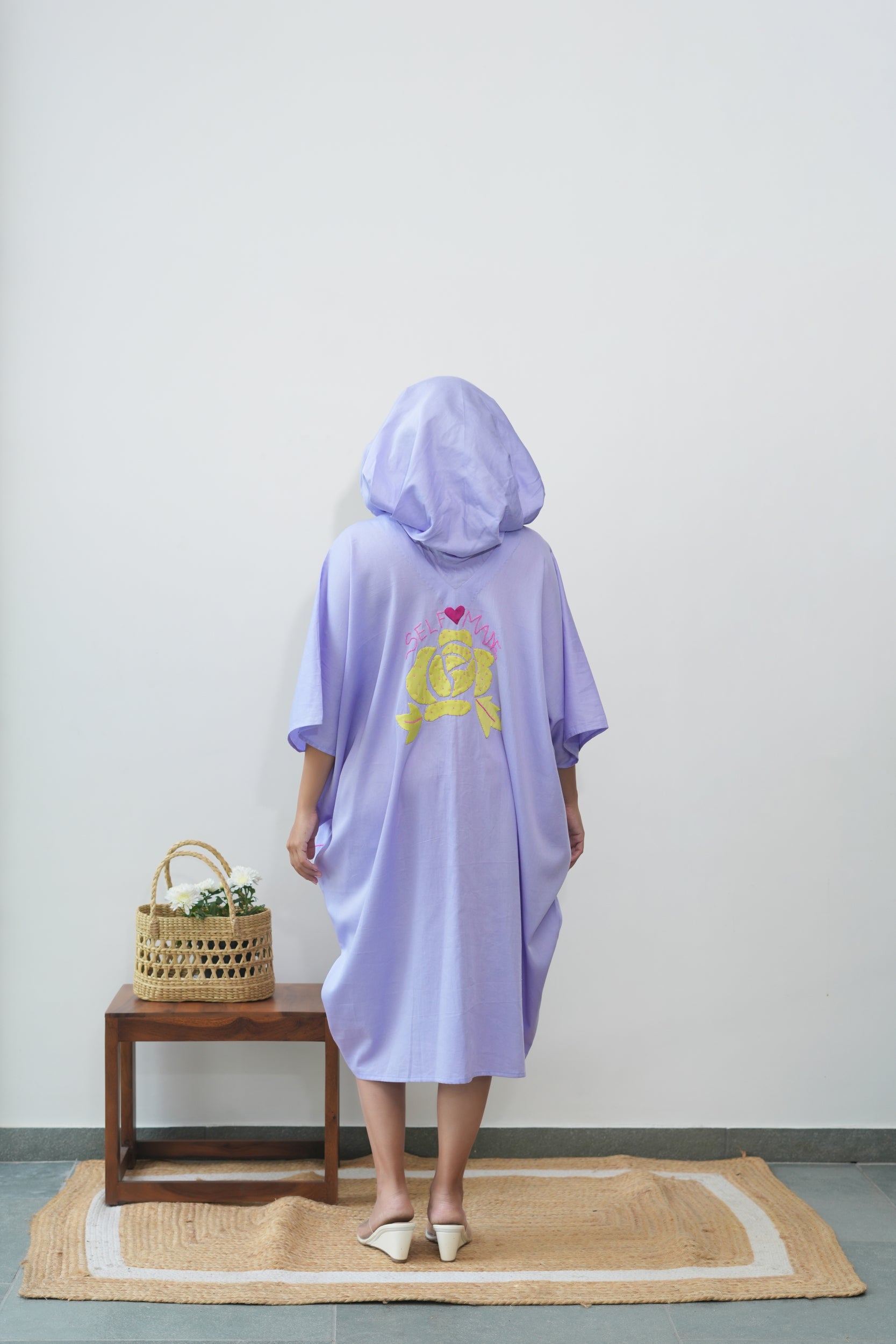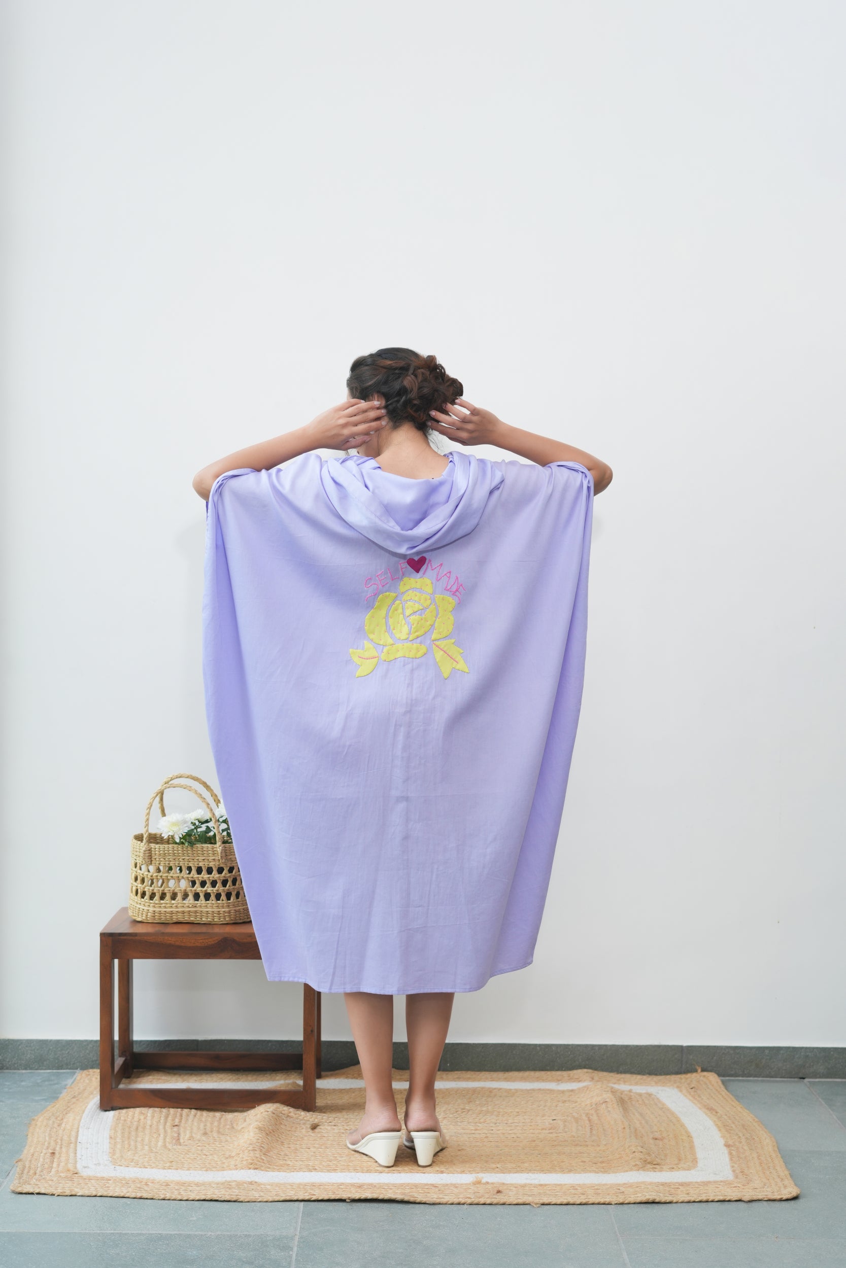 A statement piece with an edge, the Rebel Rose Hoodie blends handcrafted artistry with bold self-expression. Designed for versatility, this hoodie features a hand-appliquéd rose on the back, intricately embroidered with beaded lettering spelling ‘Self Made’, making it a true symbol of individuality.